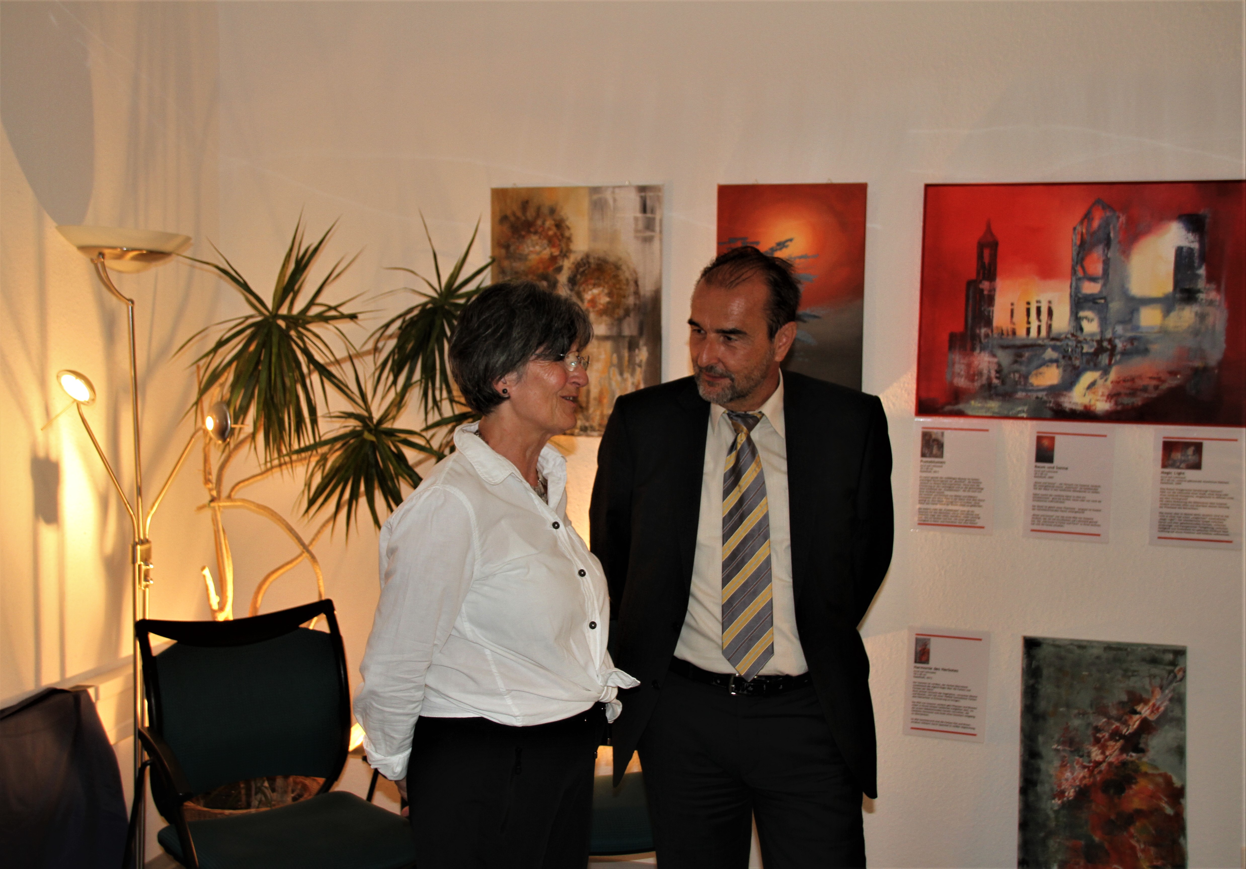 der Sozialdezernent des Landkreises Konstanz, Axel Gossner (Bild links), hier zusammen mit der Künstlerin Susanne Jendsch.